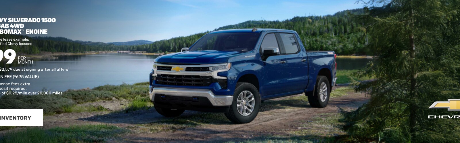 (1) Example based on national average vehicle selling price. Each dealer sets its own price. Your payments may vary. Must show proof of current lease of a 2020 model year or newer Chevy vehicle and be a current lessee for at least 30 days prior to the new vehicle sale. Customer remains responsible for current lease payments. Payments are for a 2026 Chevy Silverado 1500 LT Crew Cab 4WD with TurboMaxâ„¢ Engine with an MSRP of $54,295. 24 monthly payments total $7,175.Closed-end lease. Option to purchase at lease end for an amount to be determined at lease signing. GM Financial must approve lease. Late payment and early termination fees apply. Lessee is responsible for insuring the lease vehicle. Lessee pays for maintenance, repairs, excess wear and disposition fee of $395 or less at end of lease. Payments may be higher in some states. Not available with some other offers. Take new retail delivery by 1/2/26.